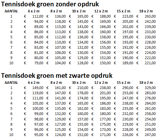 Afmetingen: doeken zijn standaard 2 meter hoog en verschillende lengtes, nl; 6, 8 , 10, 12, 15 en/of 18 meter.